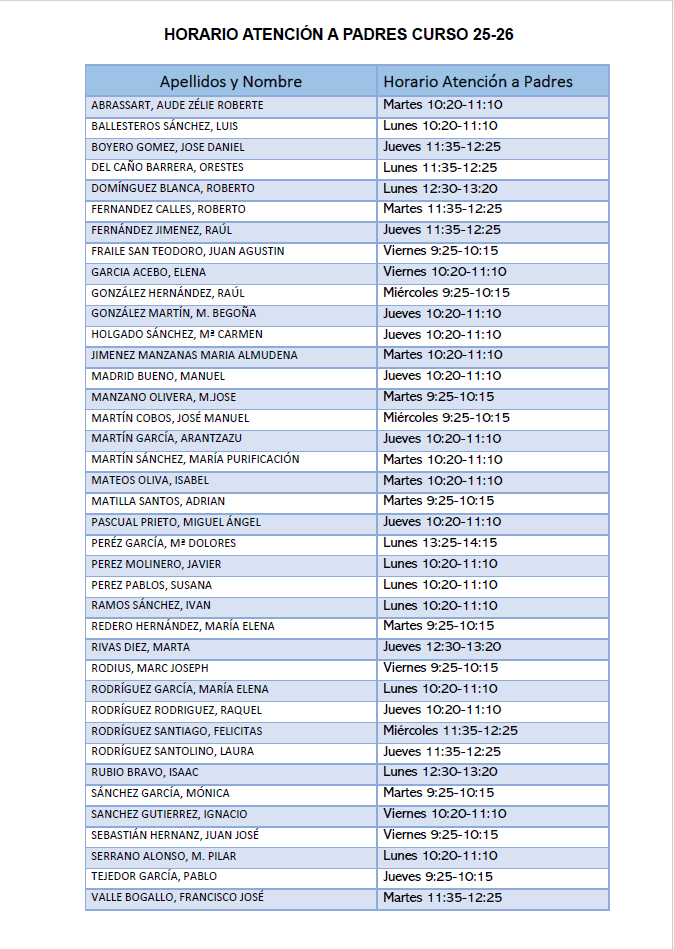 HORARIO ATENCIÓN A PADRES CURSO 2025-2026